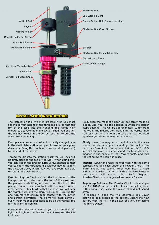 DAA Magnetic Powder Check 2.0 er utviklet for å forbedre sikkerheten og kvaliteten på omladede patroner når du bruker progressive ladepresser. Med en innovativ teknologi og et brukervennlig design, gir DAA sin pulversjekk deg nøyaktig kontroll av kruttmengden, og hjelper deg med å unngå både overladninger og manglende ladninger.