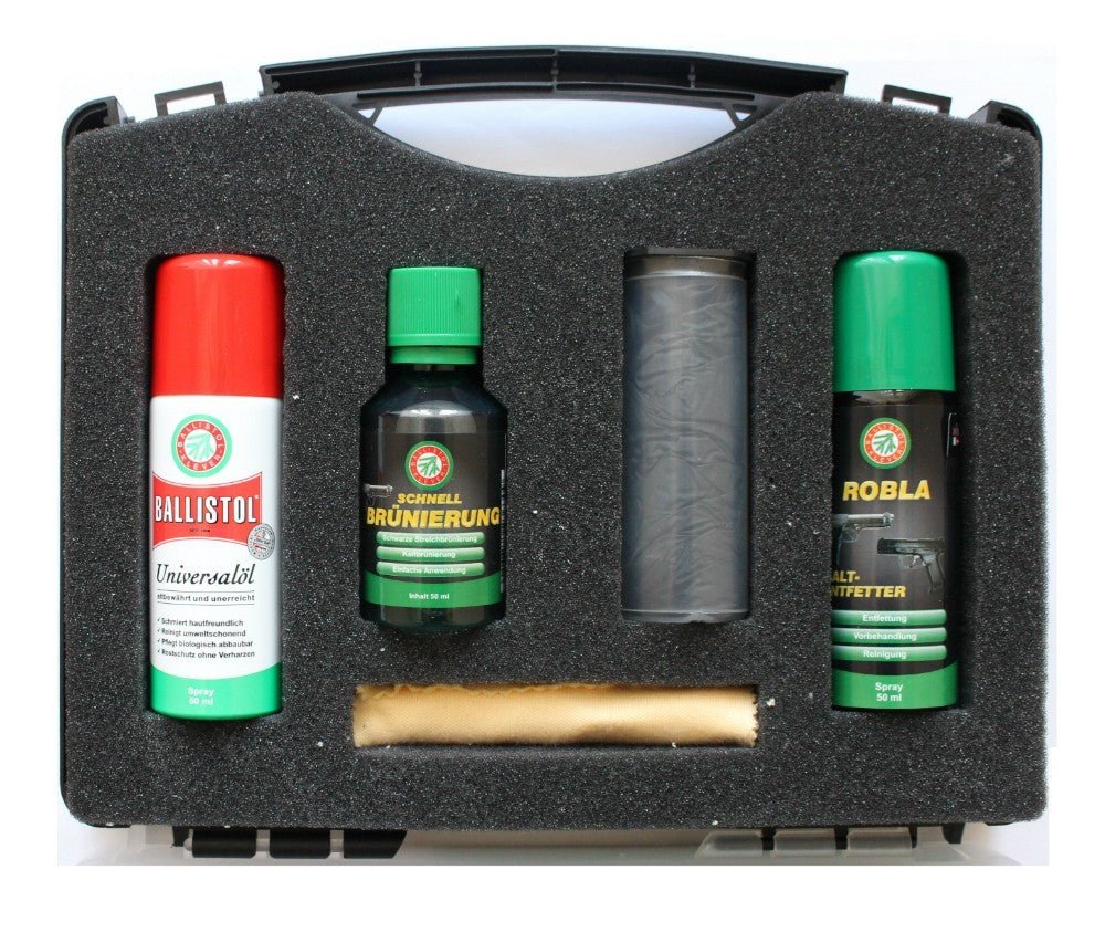 Ballistol Hurtigbrunerings Sett med alt du trenger for effektiv klargjøring, brunering og etterbehandling av alle typer våpenstål. Du oppnår en dyp, sitesterk svart matt glans på kort tid.