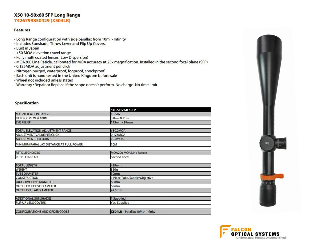• Falcon X50 10-50x60 LONG RANGE SFP MOA 1/8 MOA Riflesikte