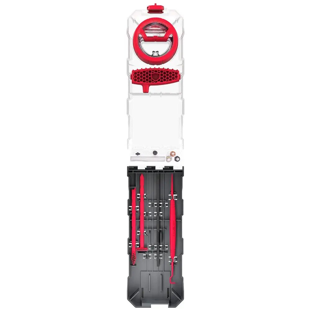 Det smarte, harde etuiet legger seg flatt når åpen, og har et brett som holder alle komponentene sikkert på plass og lett tilgjengelig.