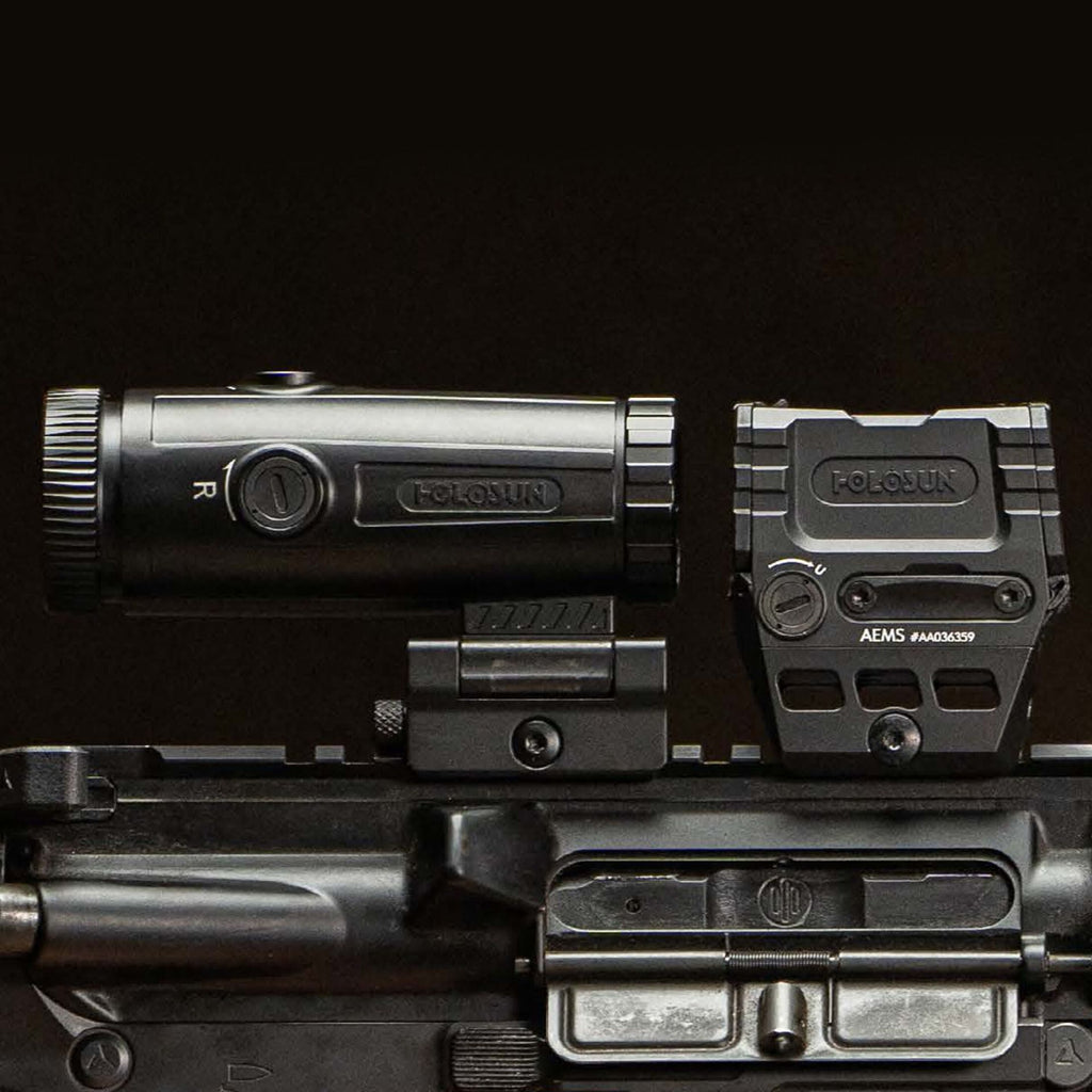 The Holosun HM6X is a 6X magnification lens with an aluminum frame, designed for use with a red dot sight. The HM6X has several features and includes a quick-release, ambidextrous, side-reversible Picatinny rail mount. The HM6X is particularly suitable for medium distances and in combination with reflex sights.