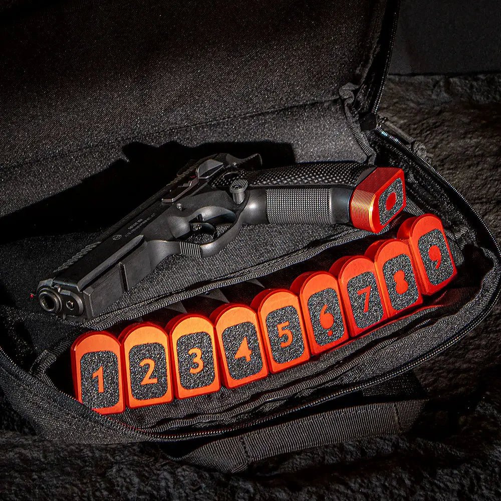 Set of 10 numbered grip tapes for magazine bases. A practical way to identify magazines and achieve a better grip when changing magazines. The pieces are laser engraved with the numbers 0 to 9, making it easy to keep track of your magazines.
