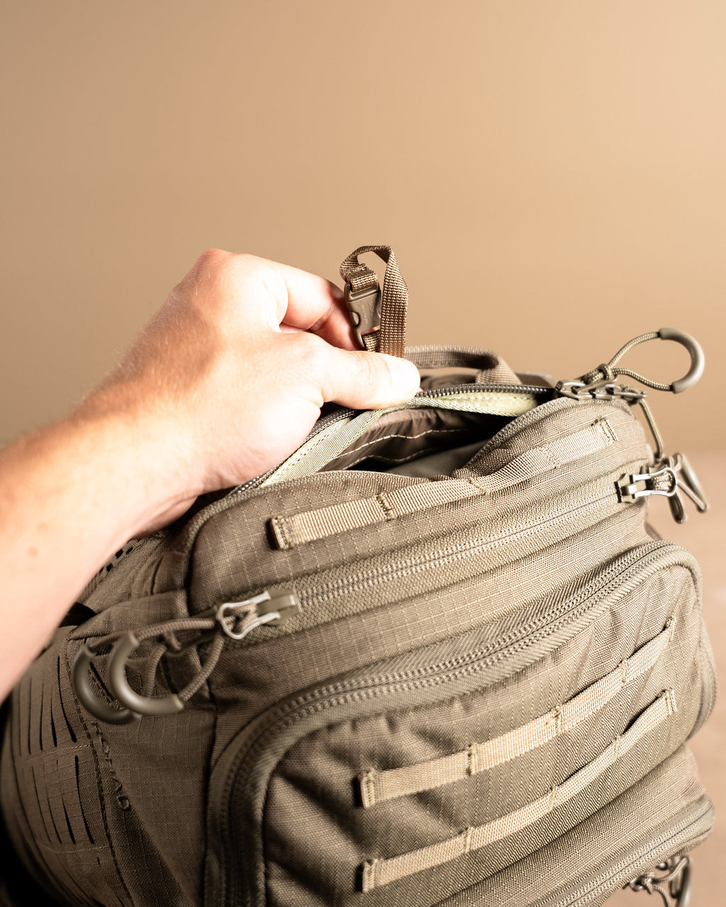 On the pack's exterior, you'll find two zippered organizational pockets. The top pocket is perfect for grab-and-go essentials, and the bottom has padding for NODs or hearing protection.