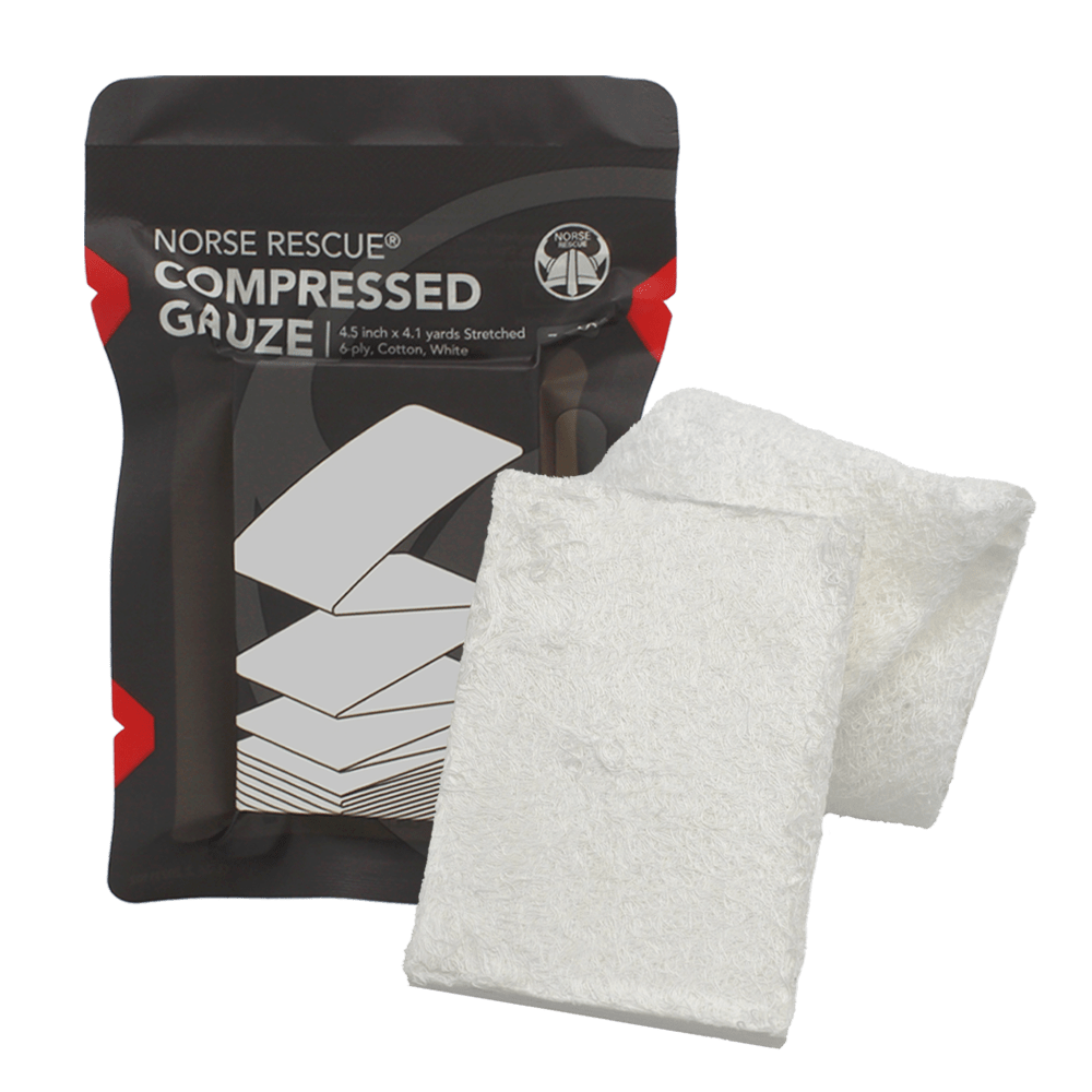 NORSE RESCUE® Komprimert Stappebandasje i Z-fold leveres vakuumforseglet for enkel oppbevaring og, når den åpnes, utvider den seg for å dekke store sårflater.