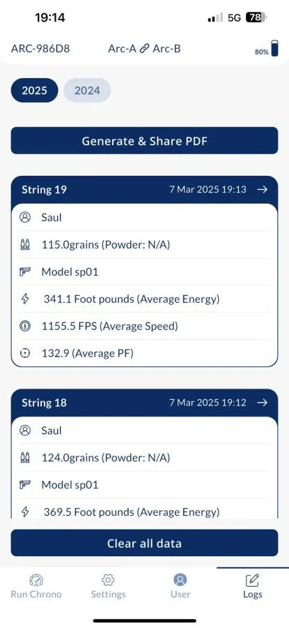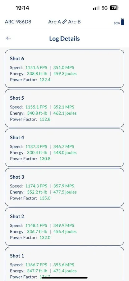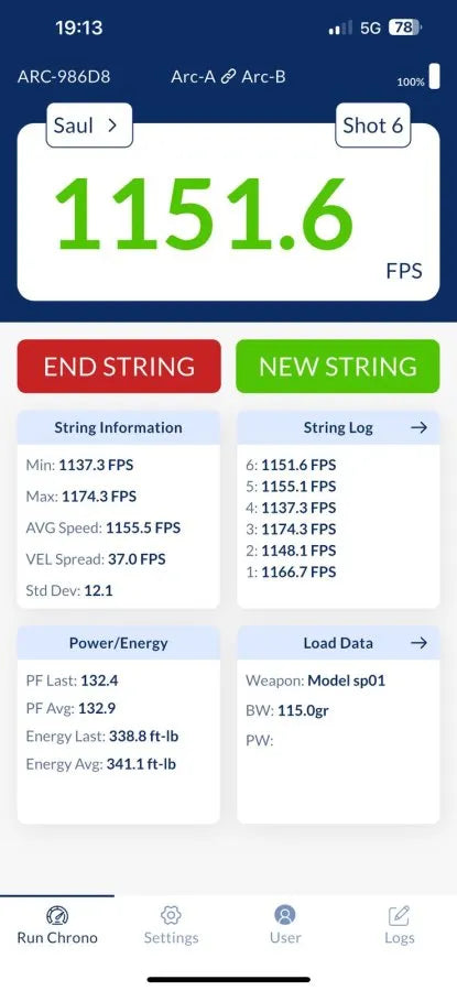 - Live Data Display: View shot velocity, standard deviation, power factor and more, instantly displayed on your device.