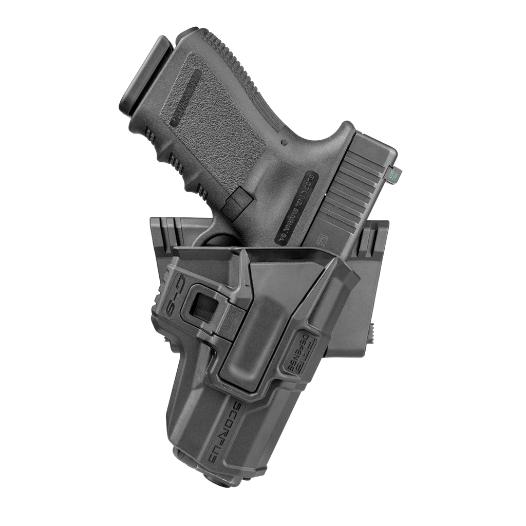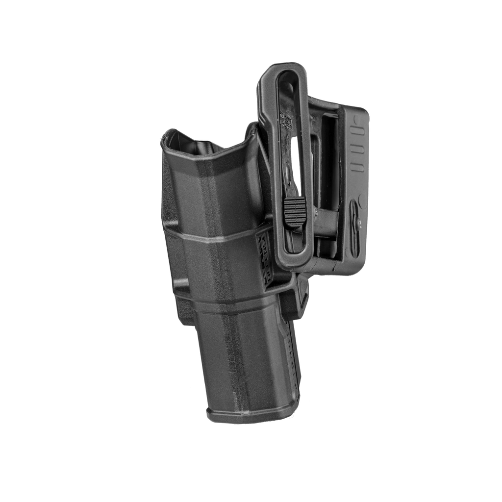 Level 1 Retention System: Hylsteret bruker to separate passive retensjons-mekanismer som automatisk låser trigger guard og sikrer pistolen. Begge er trykkaktivert og krever ingen manuell aktivering. For å trekke våpenet, grip håndtaket godt og utfør en ren, rett uttrekking – retensjonen frigjøres naturlig under bevegelsen.