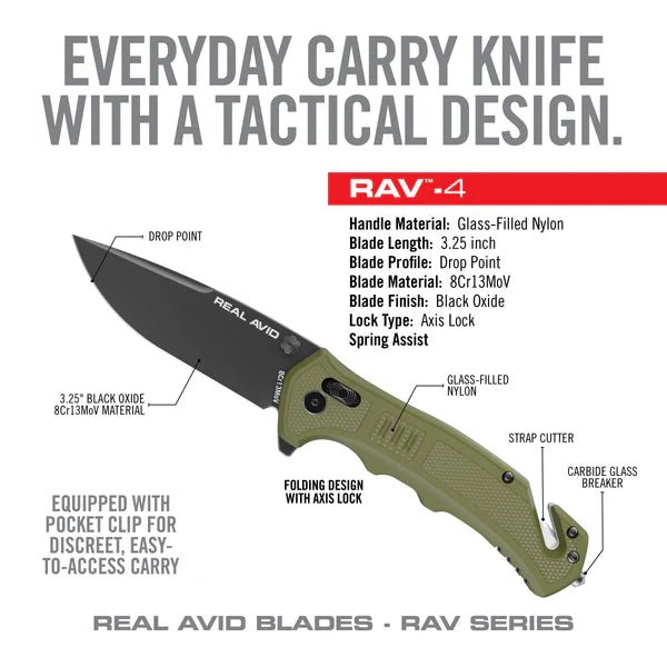 The RAV-4 Knife stands as a pinnacle of design and functionality for those who require a dependable everyday carry tool. Crafted with a handle made of glass-filled nylon, this knife is not only lightweight but extremely durable, capable of withstanding the rigors of daily use and harsh conditions without compromising on handle integrity. The use of 8Cr13MoV steel for the 3.25-inch drop point blade ensures that the knife remains sharp, strong and ready for action. Known for its impressive ability to hold an edge and overall toughness, this steel is ideal for a wide range of cutting tasks, from precision slicing to rugged use.