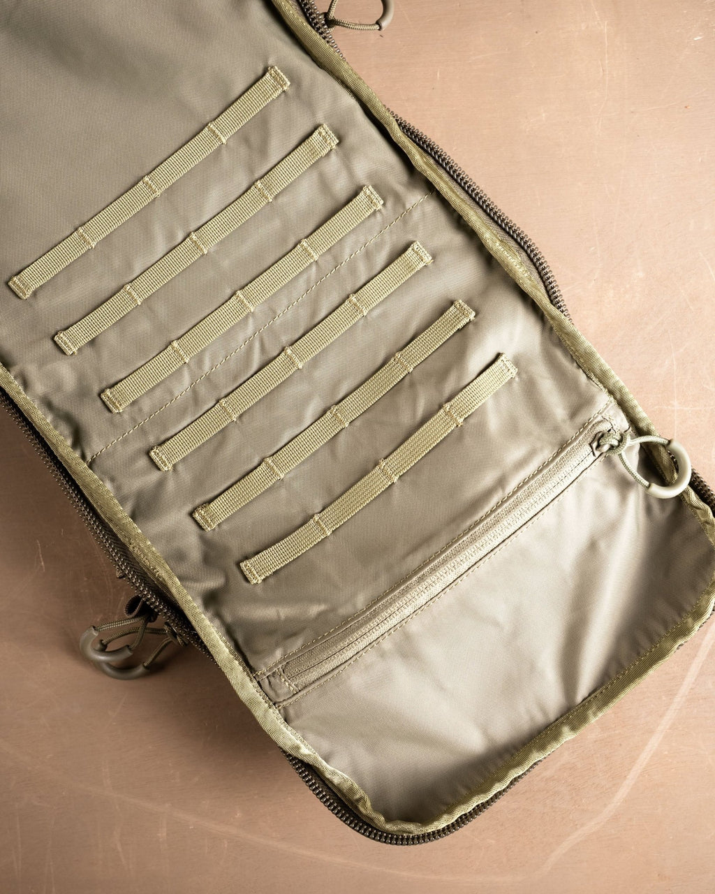 ROMAD is intentionally sized to fit communications systems like the PRC117 and has internal loop MOLLE webbing for securing additional accessories like radio pouches, Velcro holsters, or mag pouches. Locking zippers along the comms port give in-field security and work as a first line of defense against the elements.